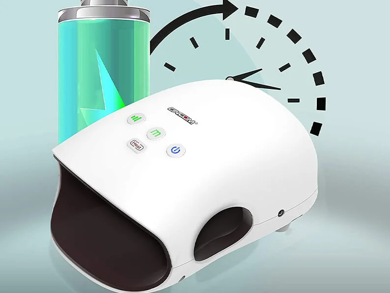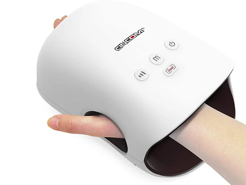 Design-wise, Cincom is one of the most compact devices on our list. But despite a slightly smaller size, it can still fit almost an entire hand inside it. Just like RelaxMit, this hand massager automatically shuts down after 15 minutes of use. That is to both save battery power and not to overly stimulate your hand muscles. Speaking of use, where it lacks in other features, Cincom makes up with simplicity. There are only four buttons in total: power (to turn the device on and off), mode (three massage modes), intensity (three intensity levels), and heat (to turn on the heating mode and select between its two levels).