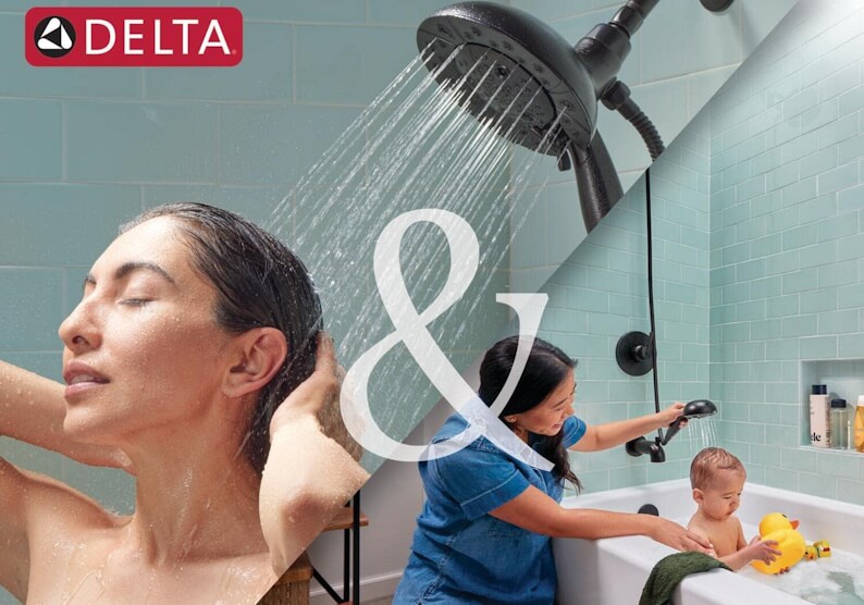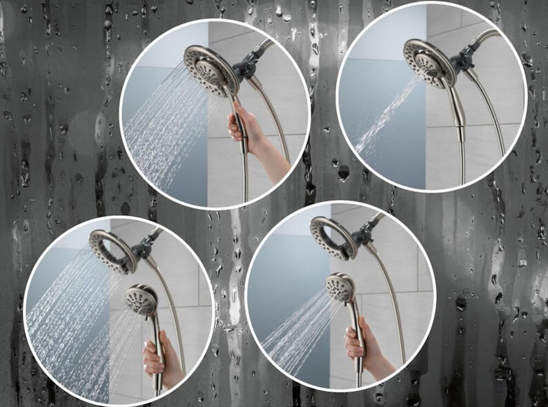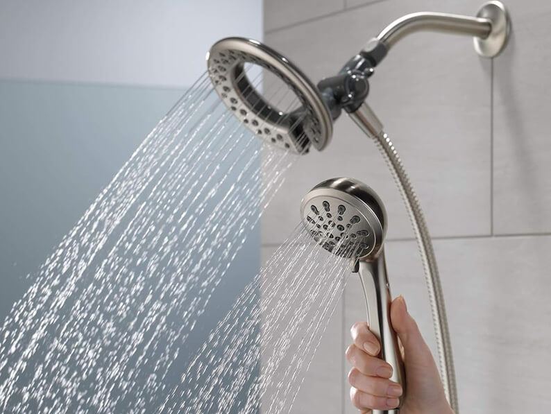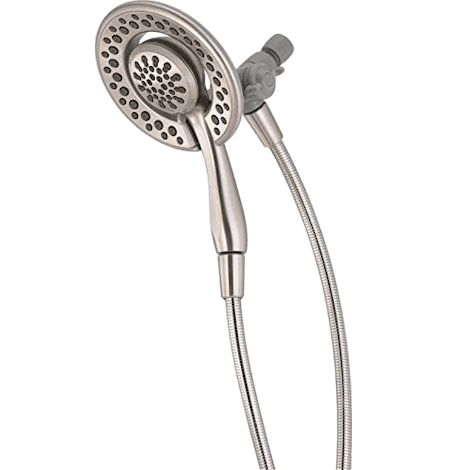 The Delta shower head combines a fixed shower with a detachable handheld sprayer, giving you flexibility in how you shower. Delta shower head features multiple spray settings and the integrated design, which allows you to use the shower head and hand shower together or separately, while soft rubber spray holes make it easy to wipe away mineral buildup.