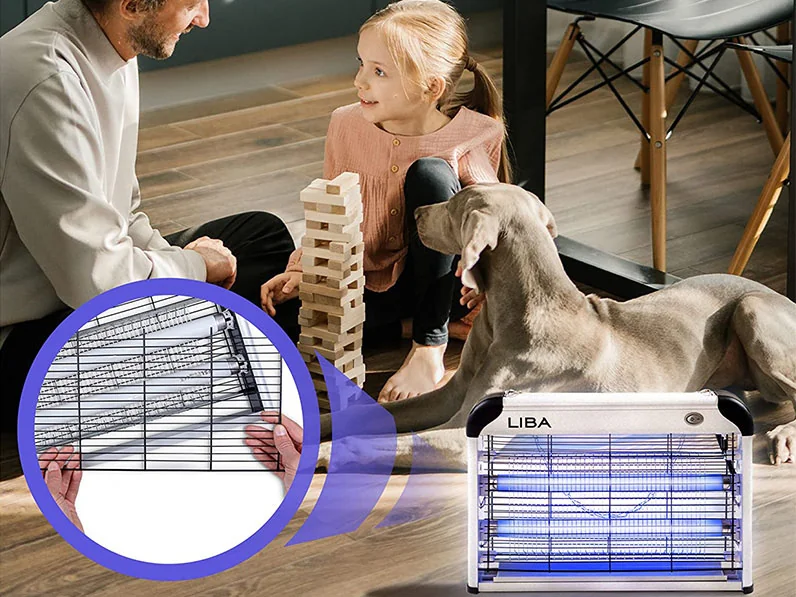 Liba est de loin l'appareil le moins élégant sur notre liste. Il est cependant très facile à utiliser, car vous n'avez pas grand-chose à faire pour le faire fonctionner. Il suffit de le brancher à une prise électrique et d'appuyer sur le bouton marche/arrêt. C'est tout ! Il est livré avec deux ampoules de rechange, qui dureront pendant un moment. Le changement d'ampoules est également très simple ; il vous suffit simplement d'enlever les glissières de sécurité, de changer l'ampoule, et de remettre les filets de sécurité à leur place. Lorsque les insectes sont en train d'être tués, vous entendez probablement le son correspondant, ce qui peut devenir un peu ennuyeux s'il y en a beaucoup.