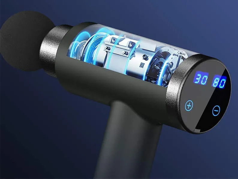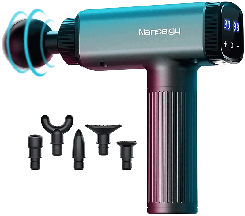 Le dernier sur notre liste est le pistolet de massage Nanssigy. Malgré son design agréable, son bon fonctionnement et ses nombreuses fonctionnalités, rien ne le distingue des autres appareils de notre liste, y compris le fait qu'il n'est pas le moins cher. C'est pourquoi, bien qu'il s'agisse d'un excellent appareil, son classement a été inférieur à celui des autres. Très similaire à Aldom en termes de conception de l'écran LCD, de commandes et de fonctions, Nanssigy dispose de 30 niveaux de vitesse et de 6 têtes remplaçables. Ces dernières sont les suivantes : boule, balle, fourche, plate, pouce et triangle. Il est également silencieux et entièrement rechargeable.