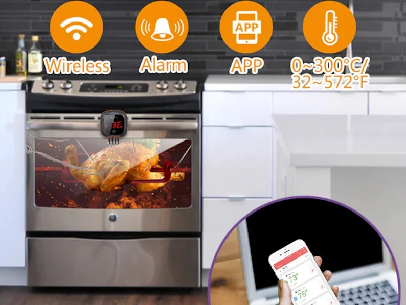 This thermometer pairs with any Bluetooth device, and the app (available on iOS and Android) lets you track the temperature for each probe and even set timers. It’s magnetic, so you can stick it to any metal surface, which helps keep it out of the way, though the cords can get a bit messy if you’re using all four probes. Design-wise, it’s functional, but it’s not exactly a “sleek” kitchen gadget. If you’re hoping for something that blends into your space, this one’s all business.