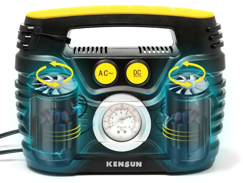 The Kensun Tyre Inflator is powered by dual metal motors, offering decent inflation speed for a variety of uses. While it may not match the fast inflation times of the PumpWhiz, Kensun still delivers solid performance, especially for home use. Its AC/DC compatibility allows for versatile power options, but the 18L/min (DC) airflow is more modest, making it best suited for smaller jobs or casual users who need an all-purpose inflator.
