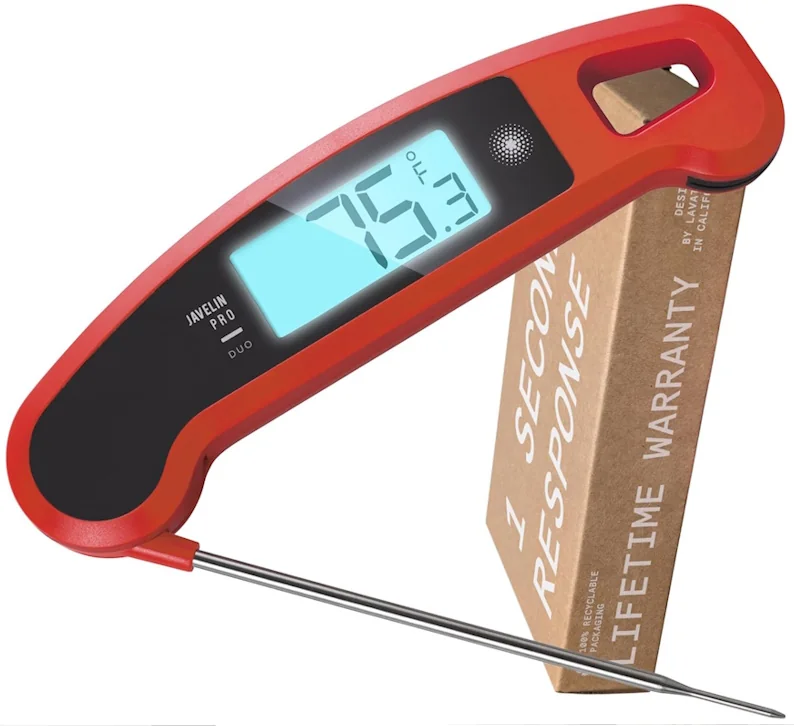 The Lavatools Javelin PRO Duo has built a bit of a reputation as a quick and straightforward kitchen thermometer. It promises fast and accurate readings, usually within 1-3 seconds, with a temperature range wide enough to cover everything from grilling steaks to checking candy stages. It has a backlit display and an auto-rotating screen, so you can get a clear reading no matter how you’re holding it—handy if you’re checking temps in awkward positions.