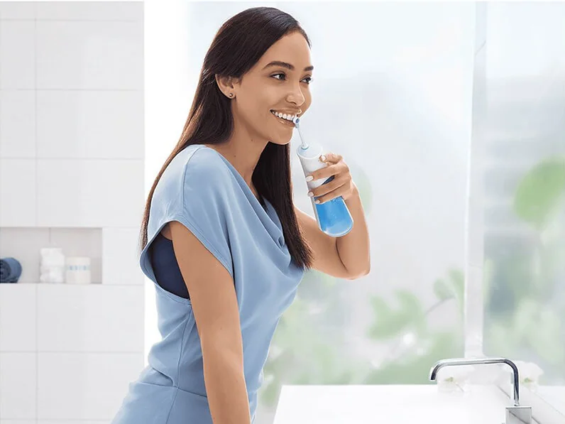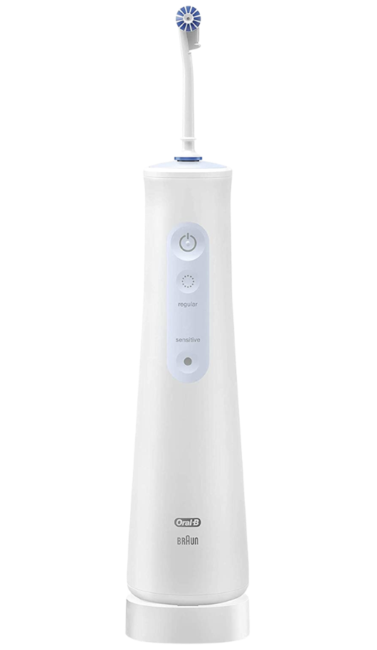 Last but not least is Oral-B Aquacare 4 water flosser. Oral-B is a beloved dental care brand, so perhaps our expectations of this device were a bit high, to begin with. But when you compare this water flosser, which is not cheap, to the ones that ranked higher, you notice there are things that set it back. Mainly – the total lack of accessories. There was only one nozzle in our box, and while it seems highly innovative and offers a couple of water stream options, it still can’t compare to FlossyFresh or Waterpik in that regard. It is similar to Panasonic, too, but with fewer accessories, a less convenient charging port, and a slightly higher price.