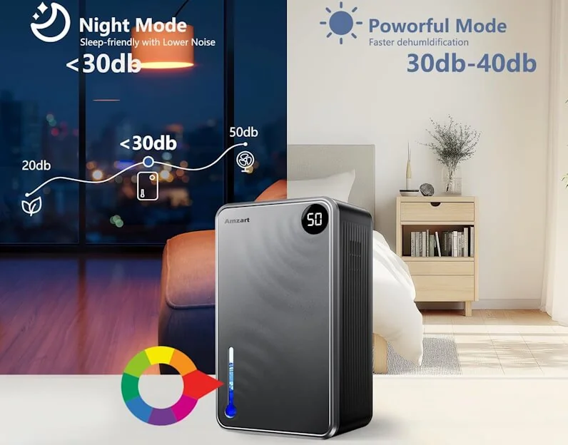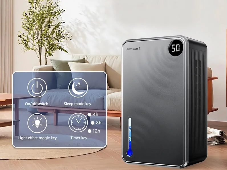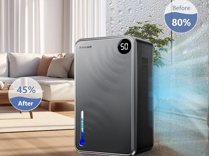 Smukły i kompaktowy osuszacz powietrza Amzart został zaprojektowany tak, aby łatwo wpasować się w wystrój wnętrza. Nowoczesna forma z prostymi liniami oraz czytelny wyświetlacz wilgotności pozwalają szybko sprawdzić aktualne warunki w pomieszczeniu. Lekka konstrukcja i wbudowany uchwyt ułatwiają przenoszenie urządzenia między pokojami. Choć wygląd jest estetyczny, część użytkowników zauważa, że jakość wykonania wydaje się mniej solidna w porównaniu z innymi modelami z tej samej kategorii.