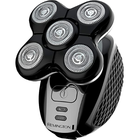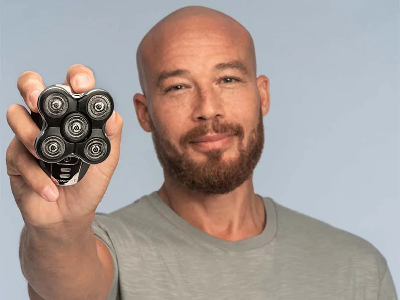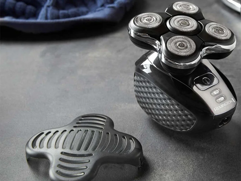 Remington XR1501 has a really nice, ergonomic body that easily fits in hand. The textured sides allow for a better grip and make it safer to use around water. It has an IPX4 waterproof rating, so it can be used for both dry and wet shaving. The blade heads each have a hair collection chamber, so the shaving process is much less messy, and cleaning them up is super easy. A really nice addition to the design is a pop-up detail trimmer. It helps if you’re wearing a beard with your bald look and need to make those sideburns sharp-lined.