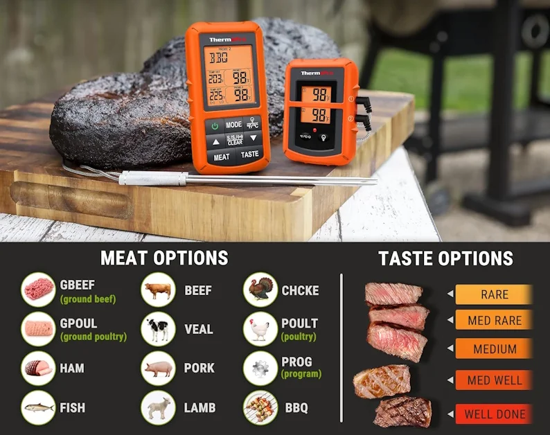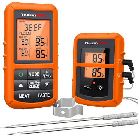 The ThermoPro TP20 is aimed at home cooks who want to keep track of multiple dishes or grill items without constantly hovering over the grill. With dual-probe functionality, it lets you monitor two separate temperatures simultaneously, whether that’s meat and grill temp or two types of meat. It also has preset temperatures for various meats and doneness levels, which can be helpful if you’re not entirely sure of the right target temps.