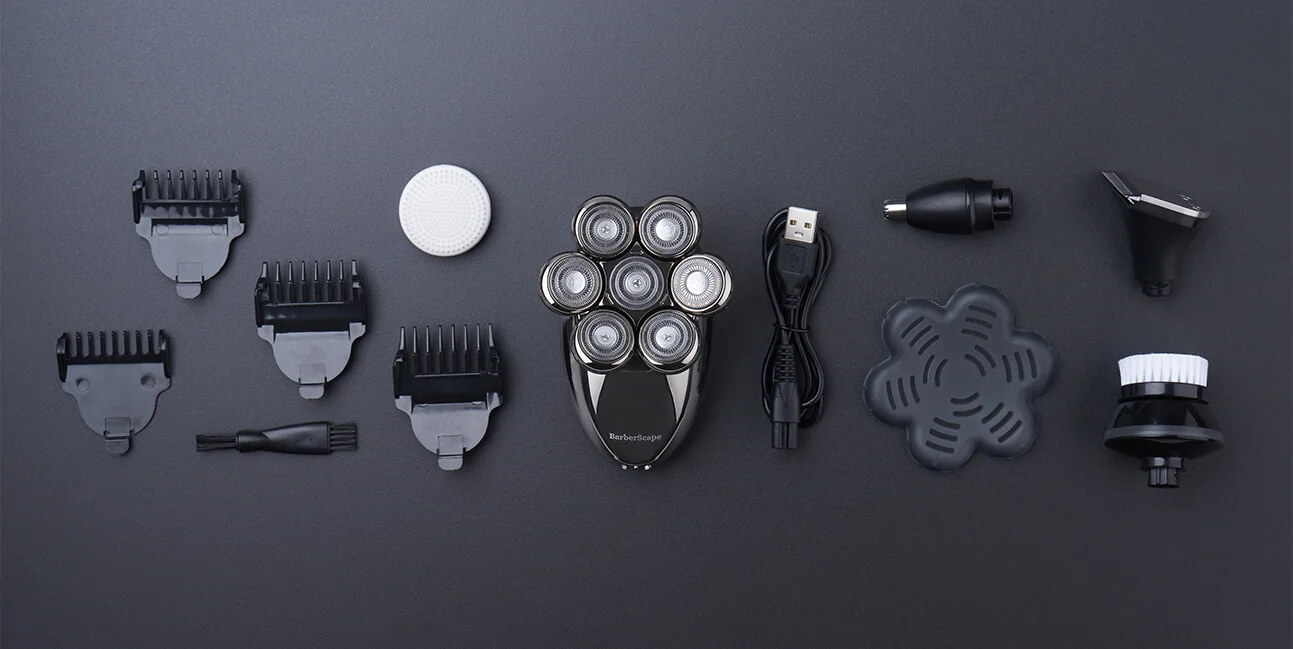 BarberScape isn’t just a simple shaver. It comes with many accessories and is a multipurpose, 5-in-1 device. The interchangeable heads include the main shaving attachment, a nose and ear hair trimmer, a precision trimmer for sideburns or shaping long beards, a face brush, and a face massager for a complete barbershop-like experience. On top of that, the precision trimmer has four attachment guards to shape hair perfectly: 3mm, 5mm, 9mm, and 12mm.